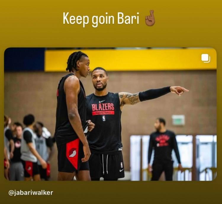 利拉德晒出了两人在开拓者训练时自己指导沃克的照片,并写到:“继续加油,Bari。”还附上了一个“cross your fingers”的表情,意为祝你好运。