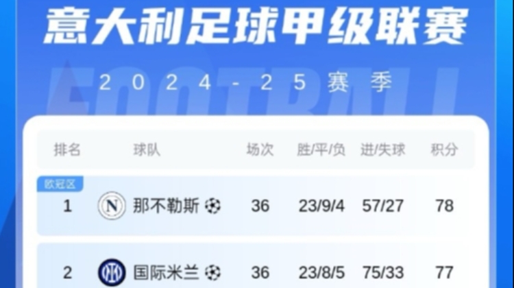 五大联赛当前仅剩意甲未决出联赛冠军,当前意甲36轮过后,那不勒斯23胜9平4负积78分排在榜首,国米23胜8平5负排在第二。两队只差1分,本赛季意甲还剩最后两轮。